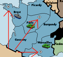 In this instance, the owner of each of these three supply centers is France. France is blue on our classic Diplomacy map, and the other six players on the classic Diplomacy map are represented with a different color.